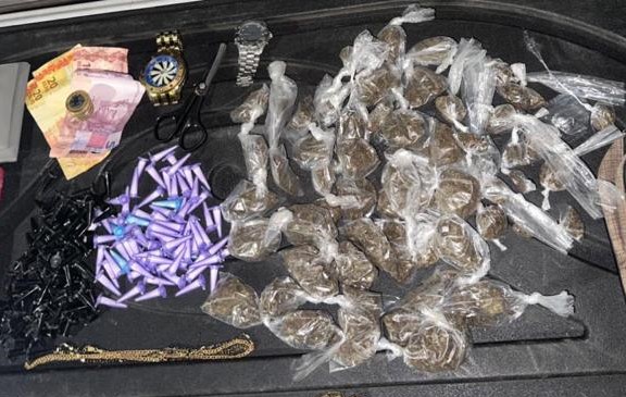 Durante a varredura, três deles foram localizados, abordados e presos. Com eles, foram encontrados 173 pinos de cocaína e 62 porções de maconha e todos os obstáculos foram removidos da via.
