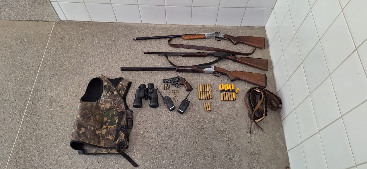 Na ação foram apreendidos um revólver calibre 38, duas espingardas, além de um rifle .22, cartuchos, dois rádios comunicadores, carregadores, binóculo e jaleco.