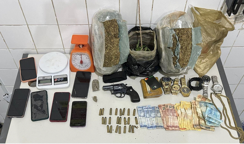 Com ele foram apreendidos cerca de 5 kg de maconha, um revólver calibre 38, munições, 13 pinos de cocaína, sete celulares, duas balanças e 598 reais.