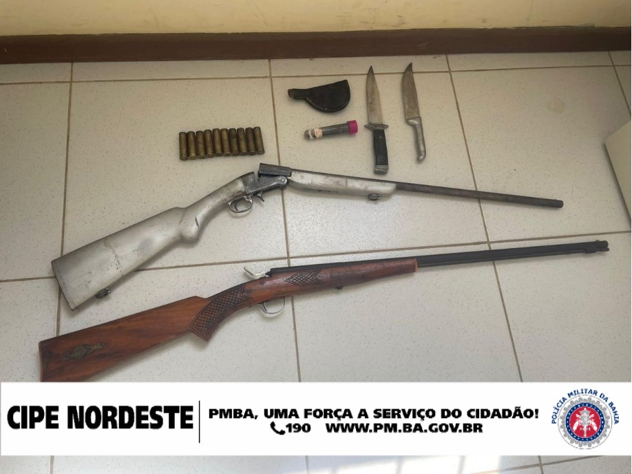Policiais militares da Companhia Independente de Policiamento Especializado (Cipe) Nordeste apreenderam duas espingardas e detiveram um homem em Sátiro Dias, na tarde de segunda-feira (27).
