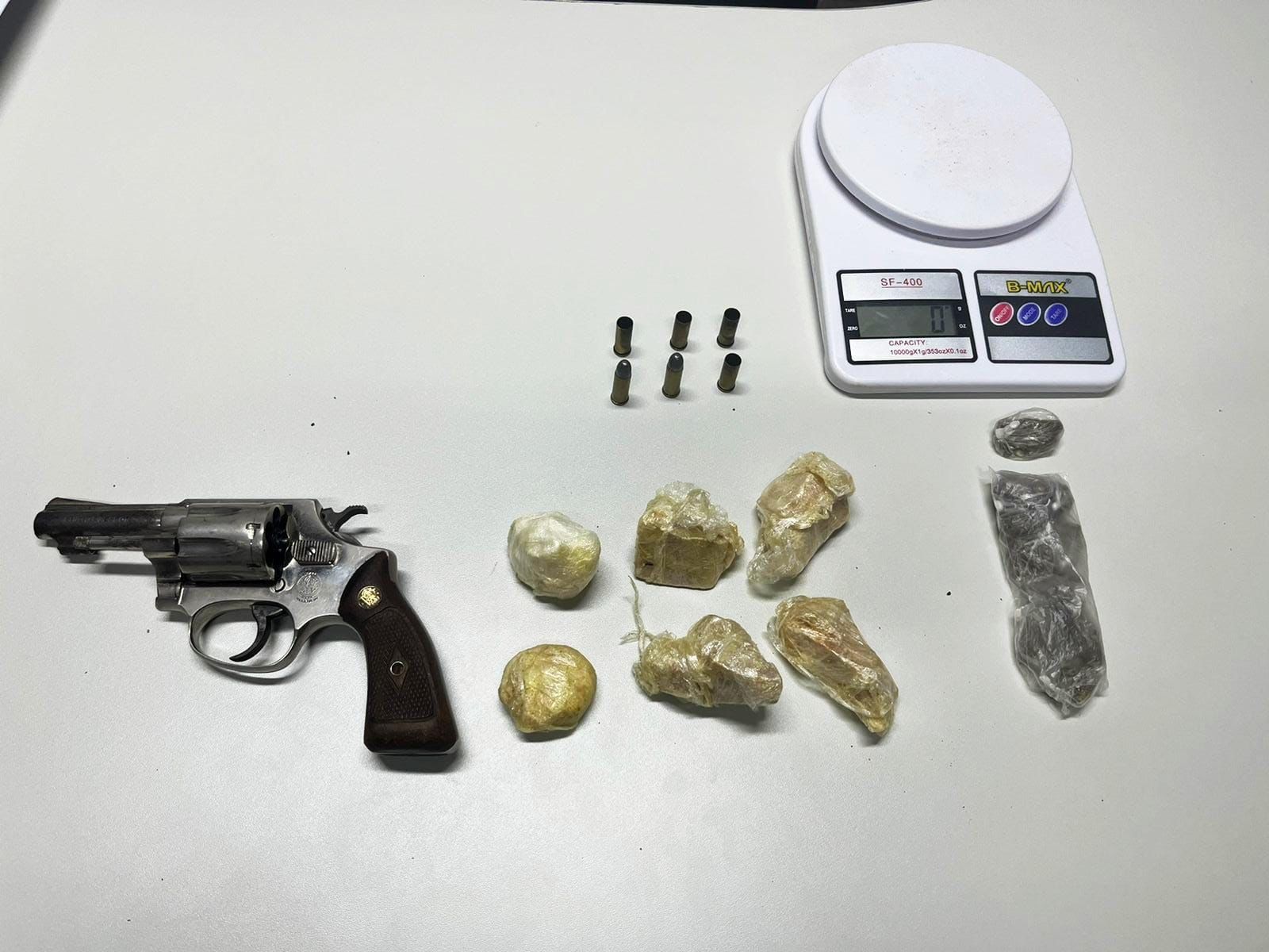 Com ele foi encontrado com um revólver calibre 32, 18 gramas de maconha, 43 de cocaína, 92 de crack e uma balança.