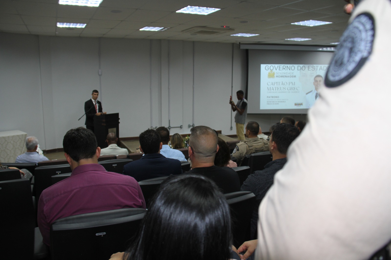 O capitão PM Mateus Grec Carvalho Marinho de Queiroz, que faleceu em 2021 durante ação policial no bairro de Cosme de Farias, foi homenageado nesta quarta-feira (6), durante inauguração do auditório do prédio administrativo da Secretaria da Segurança Pública da Bahia, batizado com o nome do profissional.