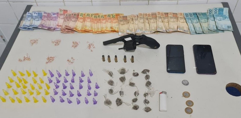 Com a mulher, foram aprendidos 22 porções de maconha, 22 de cocaína e 78 de crack. Já com os outros cinco indivíduos foram encontrados um revólver e munições de calibre 38, 19 porções de maconha, 58 de cocaína e 67 de crack.