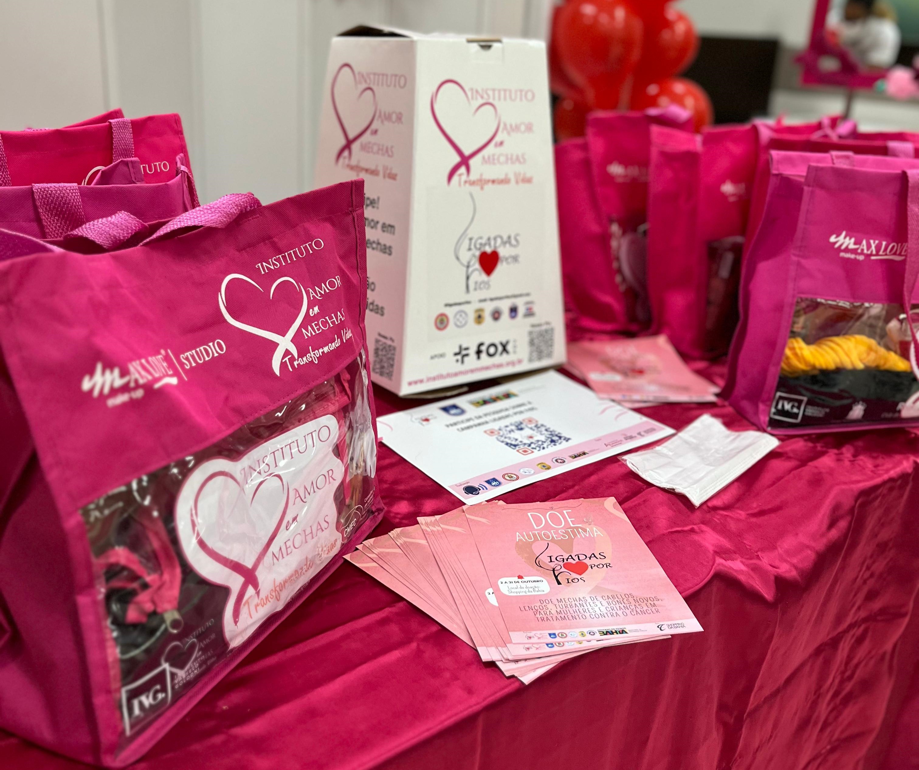Cada item entregue contém ainda lenço, máscara, turbante, brinco, colar de pérolas e dois livros com temática da elevação da autoestima. As perucas são confeccionadas em parceria com o Instituto Amor e Mechas.