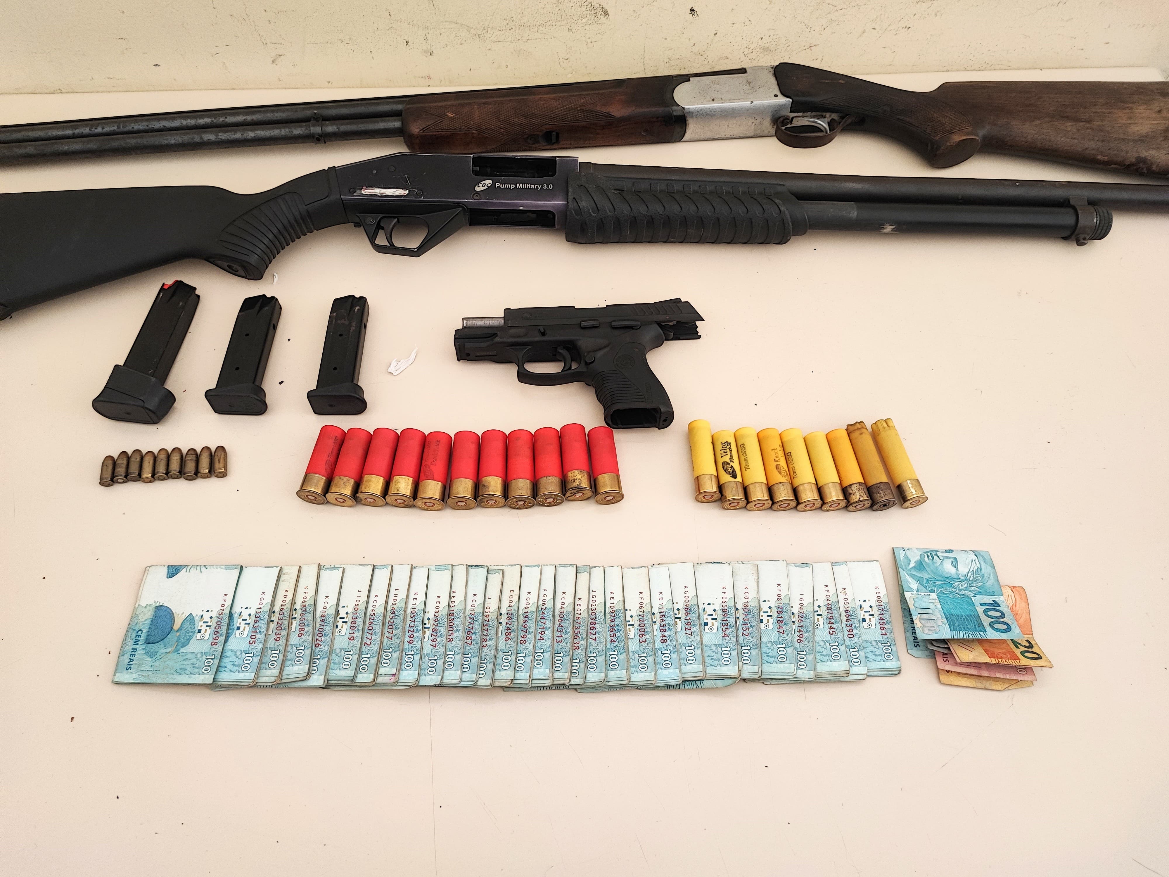 Uma pistola calibre 380, duas espingardas calibres 12 e 20, carregadores, munições e 30 mil reais em espécie foram apreendidos.