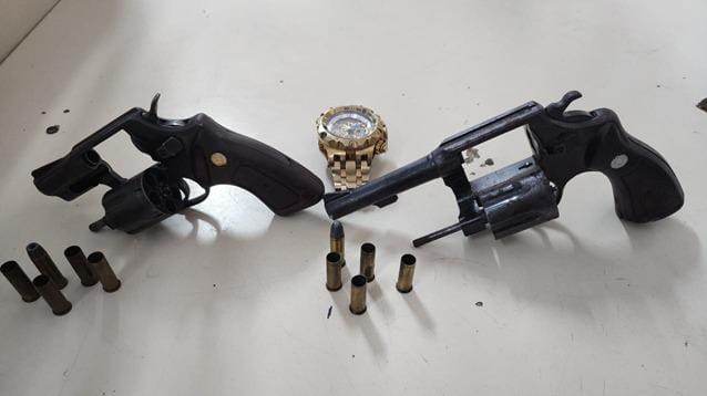 Com eles foram apreendidos dois revólveres calibre 38 e munições. As Forças de Segurança seguem na região procurando comparsas da dupla.