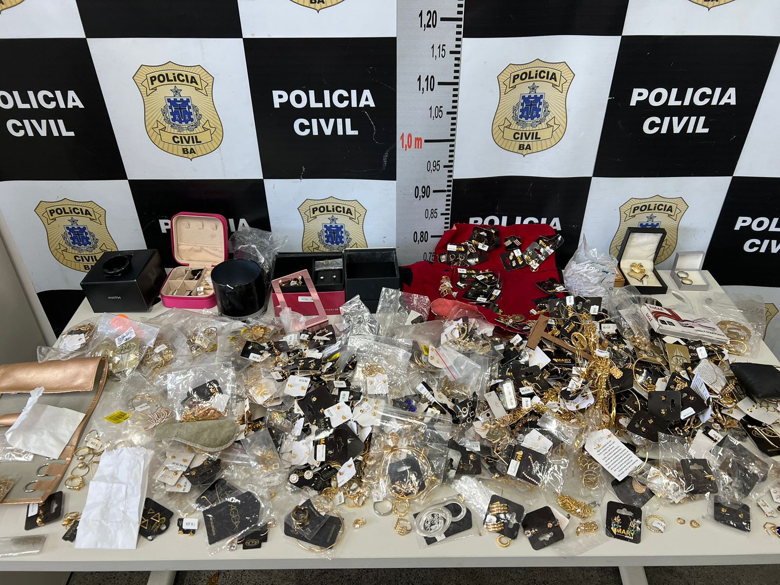 Seiscentos e dez pares de brincos, 52 pulseiras, 90 conjuntos de brincos e argolas, 80 alianças, 140 anéis, 65 cordões, três braceletes, dois pingentes, um relógio e 200 peças avariadas foram apreendidos com um homem. Ele levava as joias dentro de uma mochila, quando foi abordado pelos policiais nas imediações do Terminal Rodoviário de Feira de Santana.