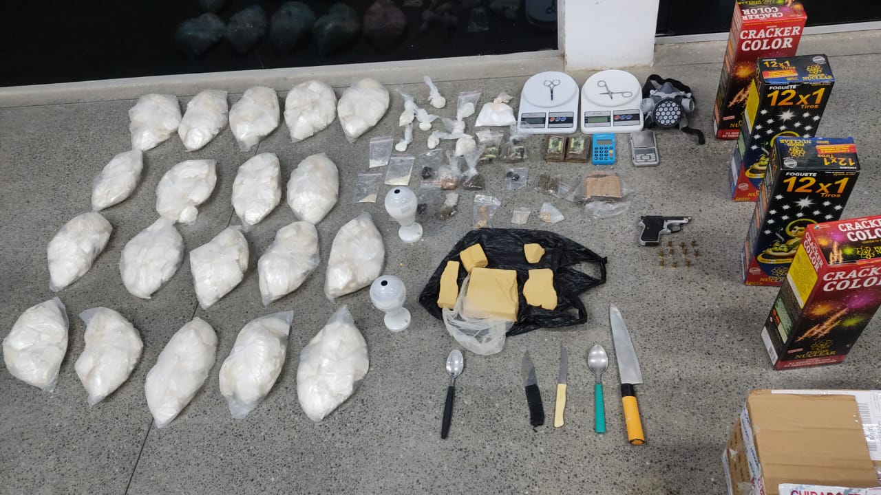 Com ela, foram encontrados: uma pistola cal. 635 com um carregador e dez munições do mesmo calibre; aproximadamente 7 kg de cocaína, além de quase 1 kg de pasta base; cinco porções de crack; quatro placas de haxixe e seis porções da mesma; uma porção de maconha; seis balas de exctasy; três balanças de precisão; uma máscara com filtro químico; uma máquina de cartão; duas lâmpadas espiãs; quatro caixas de foguetes sinalizadores; uma mala contendo diversas embalagens para acondicionamento de entorpecentes e diversos utensílios para manipulação de drogas.