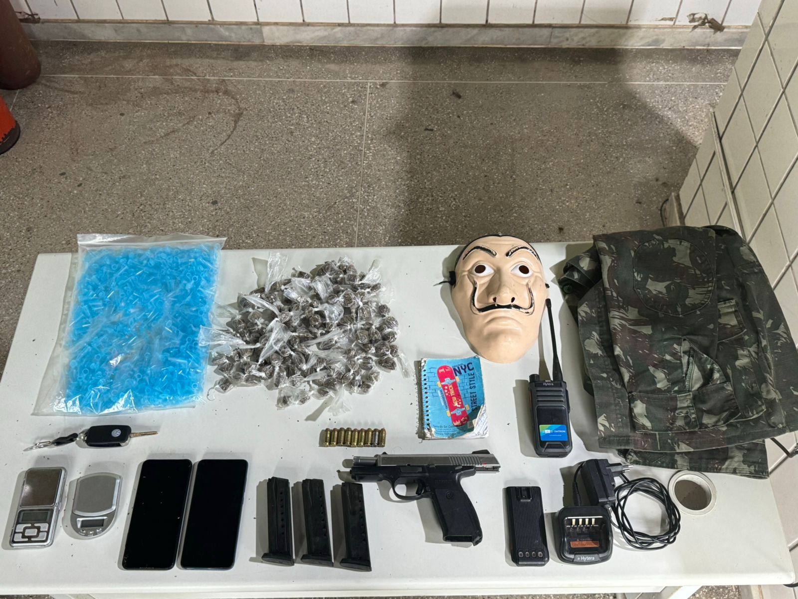 Também foram apreendidos na ação um rádio comunicador com bateria extra e base de carregador; dois aparelhos celulares, uma jaqueta camuflada; um veículo Gol de cor prata e uma máscara que atores de uma série espanhola utilizavam para praticar crimes de roubo.