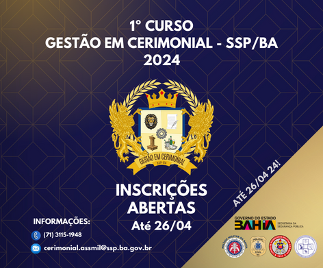 A Secretaria da Segurança Pública iniciou nesta sexta-feira (19), as inscrições para o Curso de Gestão em Cerimonial da SSP- 2024. A formação inédita, coordenada pelo Setor de Cerimonial da pasta, oferece 30 vagas para integrantes das Forças da Segurança Pública, instituições integrantes do Sistema Estadual de Segurança Pública, Secretarias Estaduais e instituições da Bahia, além de outros estados.