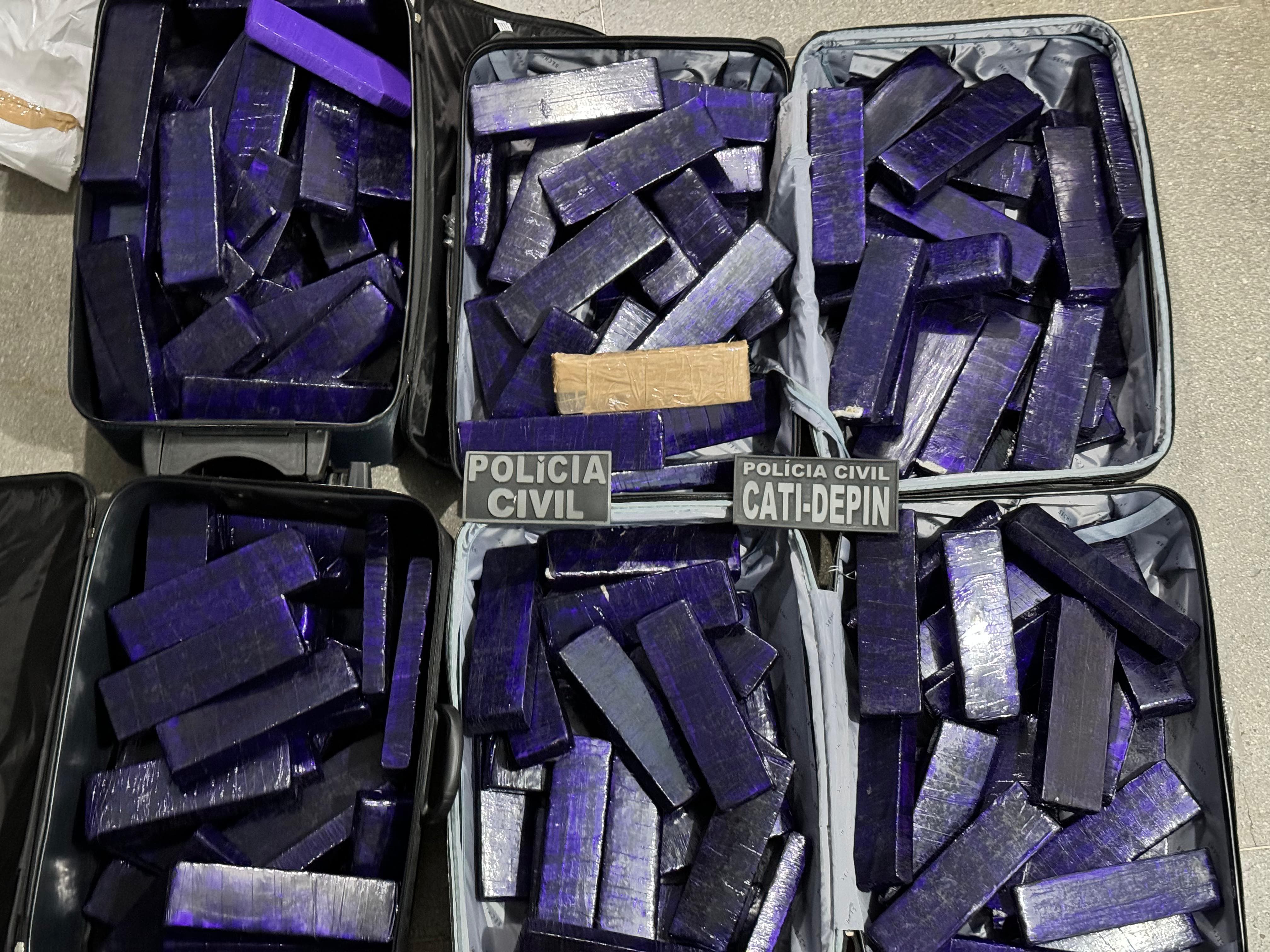 Durante as inspeções, foram encontradas quatro malas contendo 152 tabletes de maconha e os policiais identificaram as proprietárias da bagagem.