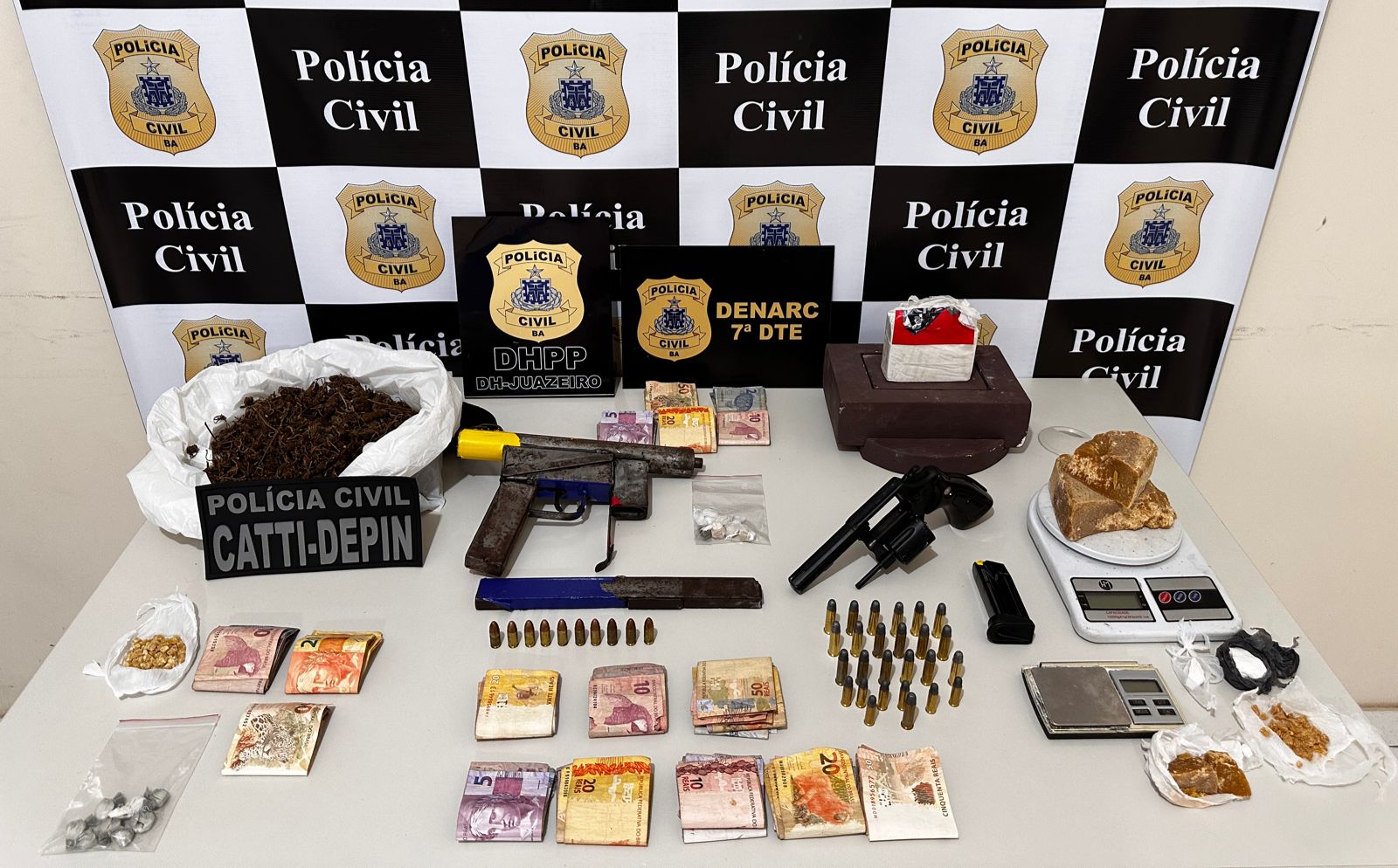 Foram apreendidas porções de cocaína, crack e maconha, além de uma submetralhadora artesanal, um revólver, munições de diversos calibres, um carregador de pistola, duas balanças de precisão e R$ 1.284,00.