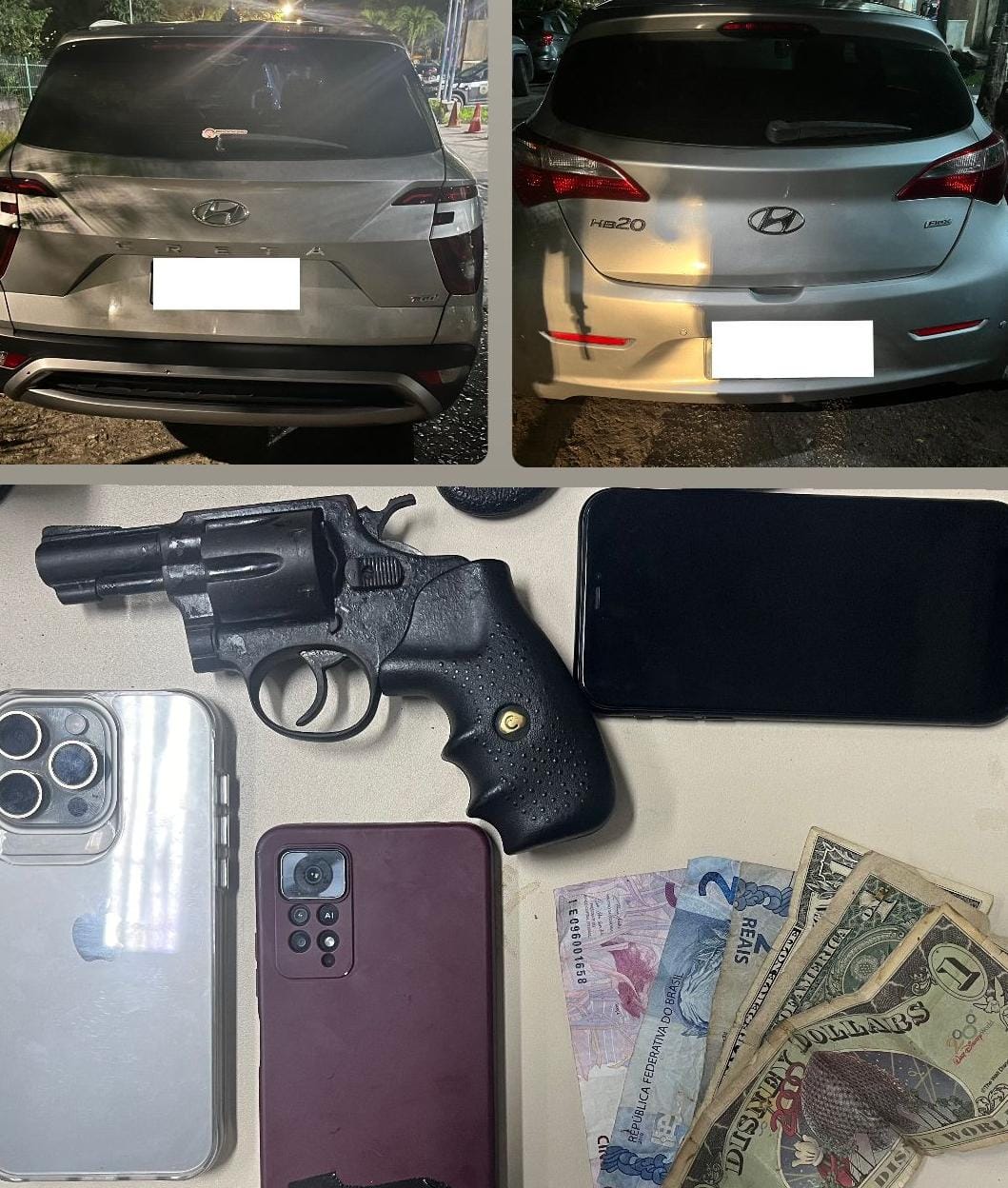 Os dois ocupantes dos carros foram presos, sendo encontrados, com eles, um revólver calibre 32 com numeração raspada e o telefone celular de propriedade da vítima. Os pms também constataram que a placa do carro de apoio, que pertence ao pai de um dos suspeitos, havia sido adulterada com fita isolante para dificultar o reconhecimento.