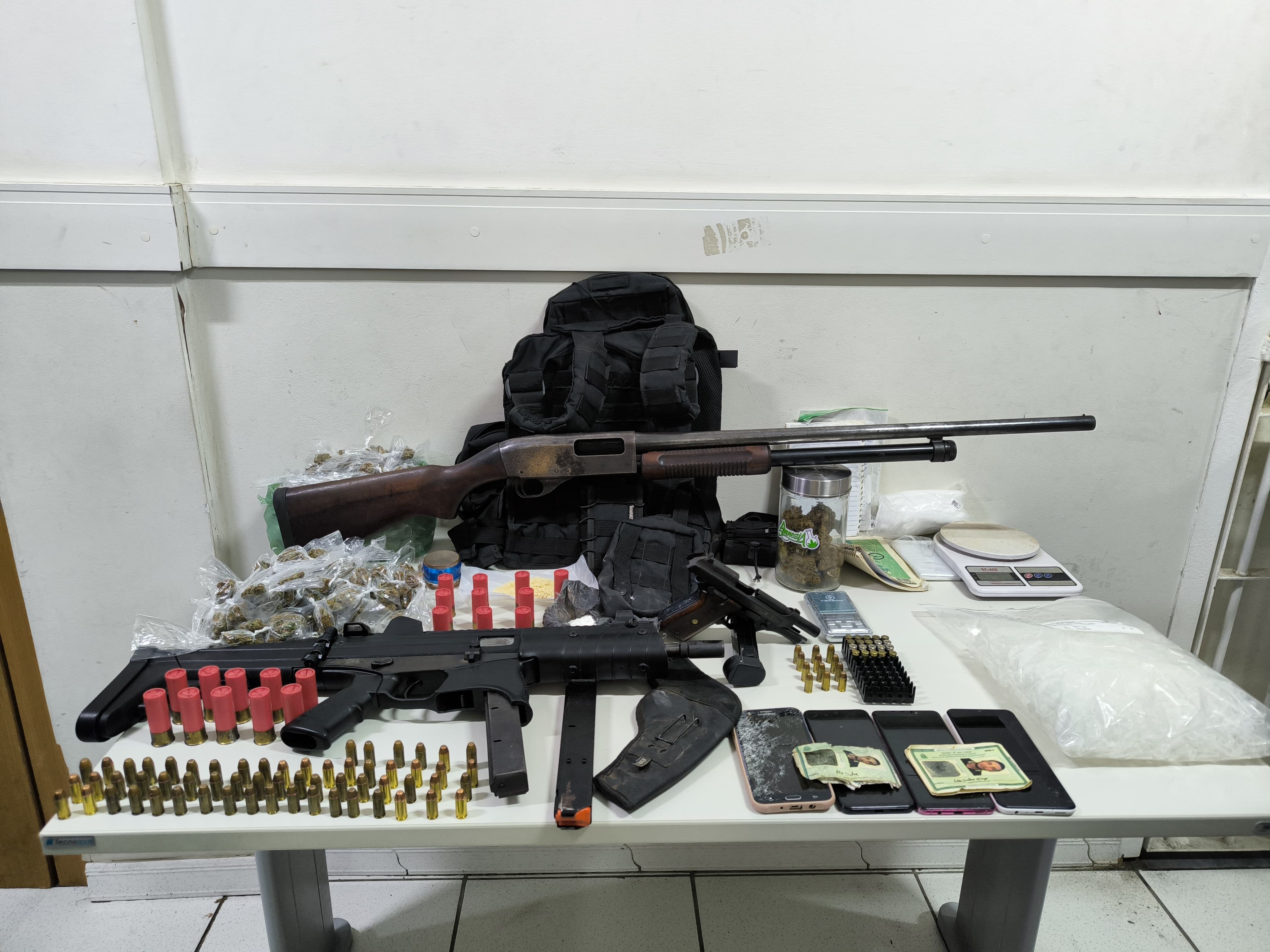 Com Patolino foram apreendidos uma submetralhadora calibre 40, uma espingarda calibre 12, uma pistola, carregadores, munições, um colete tático balístico, drogas e uma balança.