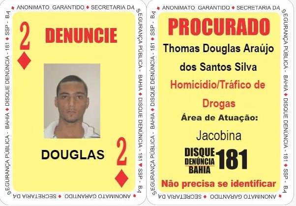 Equipes da Força Integrada de Combate ao Crime Organizado (FICCO) Bahia e das Polícias Militar (Cipe Caatinga) e Civil (Depin) localizaram nesta quinta-feira (18), o 2 de Ouros do Baralho do Crime da Secretaria da Segurança Pública. Thomas Douglas Araújo dos Santos Silva, o "Patolino", liderava uma facção com atuação na região Norte e foi encontrado na cidade de Capim Grosso.