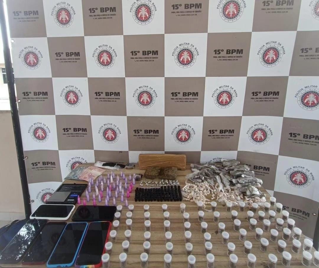 Com eles, foram encontradas 254 pedras de crack, 50 pinos de cocaína, 206 porções de maconha e um tablete da mesma substância, 259 porções de haxixe e dinheiro em espécie.