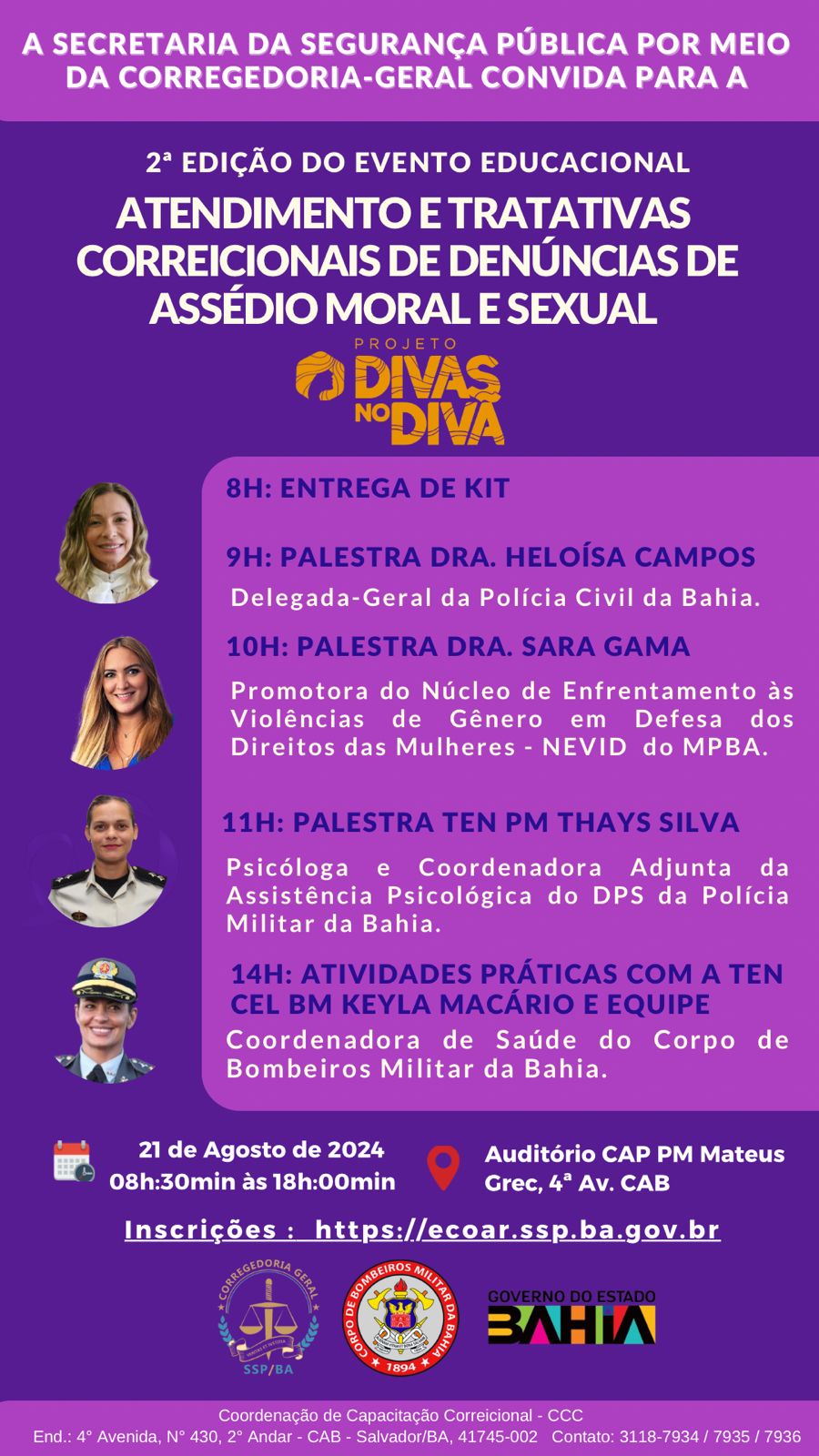 A Corregedoria Geral da Secretaria da Segurança Pública realiza, na quarta-feira (21), a segunda edição do evento educacional Atendimento e Tratativas Correicionais de Denúncias de Assédio Moral e Sexual para servidores convidados de diversas secretarias estaduais. O evento acontece no auditório Cap PM Mateus Grec, situado no prédio administrativo da SSP, no Centro Administrativo da Bahia.