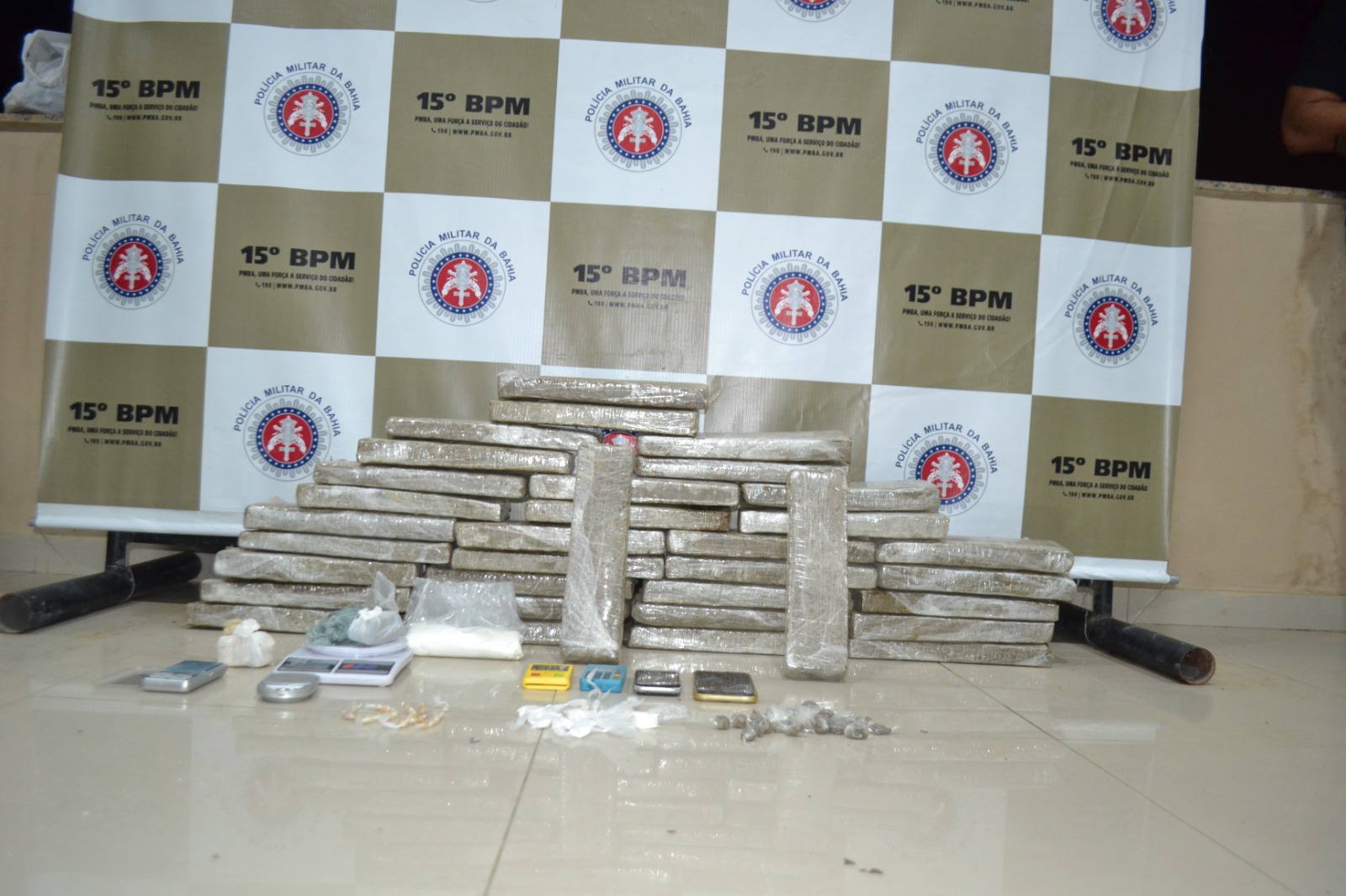 As guarnições desenvolviam ações de policiamento no bairro Califórnia quando um grupo de suspeitos foi avistado e fugiu. Durante a varredura, foram encontrados 34 kg de maconha, uma balança de precisão, porções de cocaína e crack.