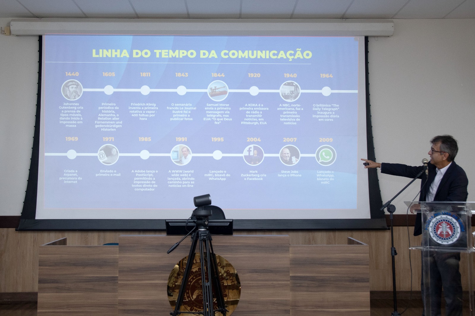 O secretário estadual de Comunicação Social, André Curvello, foi o convidado para a abertura da aula inaugural e palestrou sobre os desafios da comunicação e avanços das mídias sociais ao apresentar dados estatísticos.