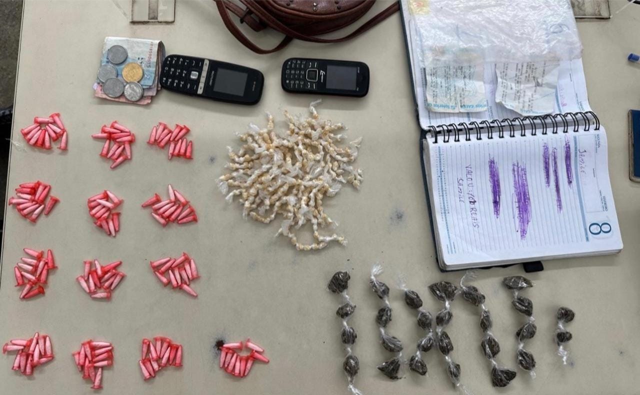 Com ela, foram apreendidas 304 porções de crack, 129 pinos de cocaína, 26 embalagens contendo maconha e um caderno com anotações referentes à comercialização de drogas.