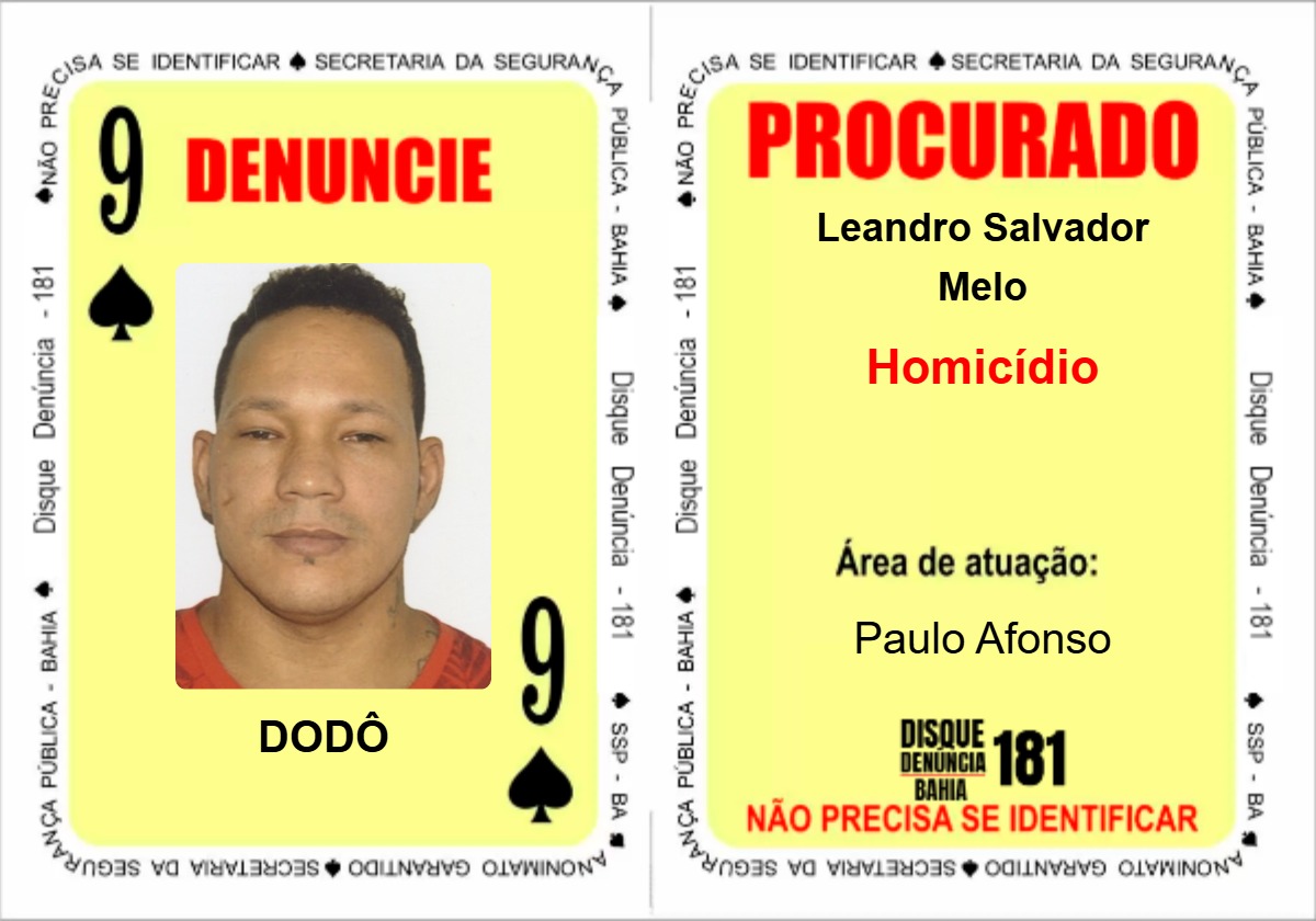 Informações sobre a localização desses foragidos e outros do Baralho do Crime, denuncie de forma anônima, gratuita e segura pelo número 181 (Disque Denúncia). Para registrar denúncia não é necessário informar dados pessoais e o número de telefone não é identificado no sistema.