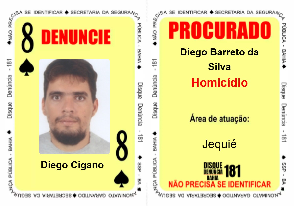Ocupando a carta ‘Oito de Espadas’, Diego Barreto da Silva, conhecido como “Diego Cigano”, é apontado como participante da chacina de quatro ciganos em Feira de Santana, em agosto de 2023. Ele também é acusado do homicídio do cigano Iomar Barreto Cabral, ocorrido em outubro de 2023, no município de Rafael Jambeiro. Três dias depois, ele ordenou a chacina de seis familiares de Iomar, em Jequié.
