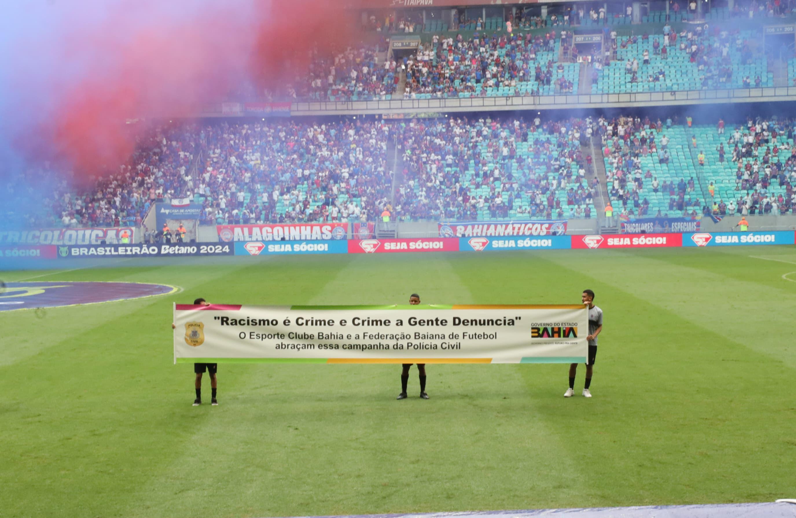 A Polícia Civil da Bahia (PCBA) intensificou as ações de conscientização e combate ao crime de racismo, com a campanha “Racismo é Crime e Crime a Gente Denuncia”, promovida pela Instituição, lançada neste domingo (24), durante a partida entre Bahia e Athletico Paranaense, na Arena Fonte Nova, em Salvador.