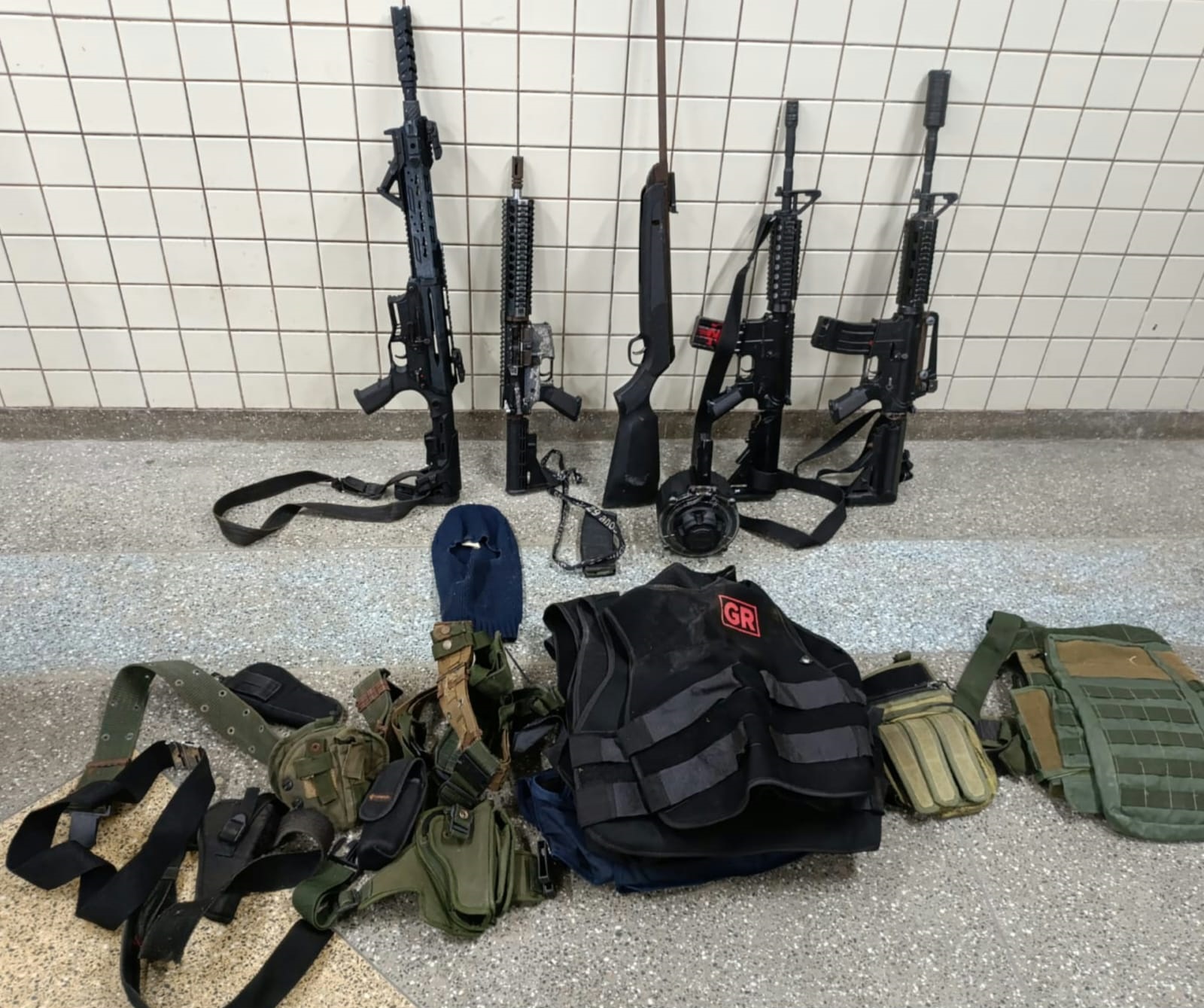 Buscas foram feitas e, após uma varredura no local onde os indivíduos estariam, os policiais encontraram um fuzil 556, uma espingarda calibre 12, uma espingarda de ar comprimido, duas réplicas de fuzil, munições de calibres 556, 762 e 12, oito capas de colete balístico, quatro coldres, um porta-carregador, uma balança de precisão, uma balaclava, carregadores para fuzis, espingarda e réplicas de armas, além de equipamentos militares. Nenhum suspeito foi encontrado.