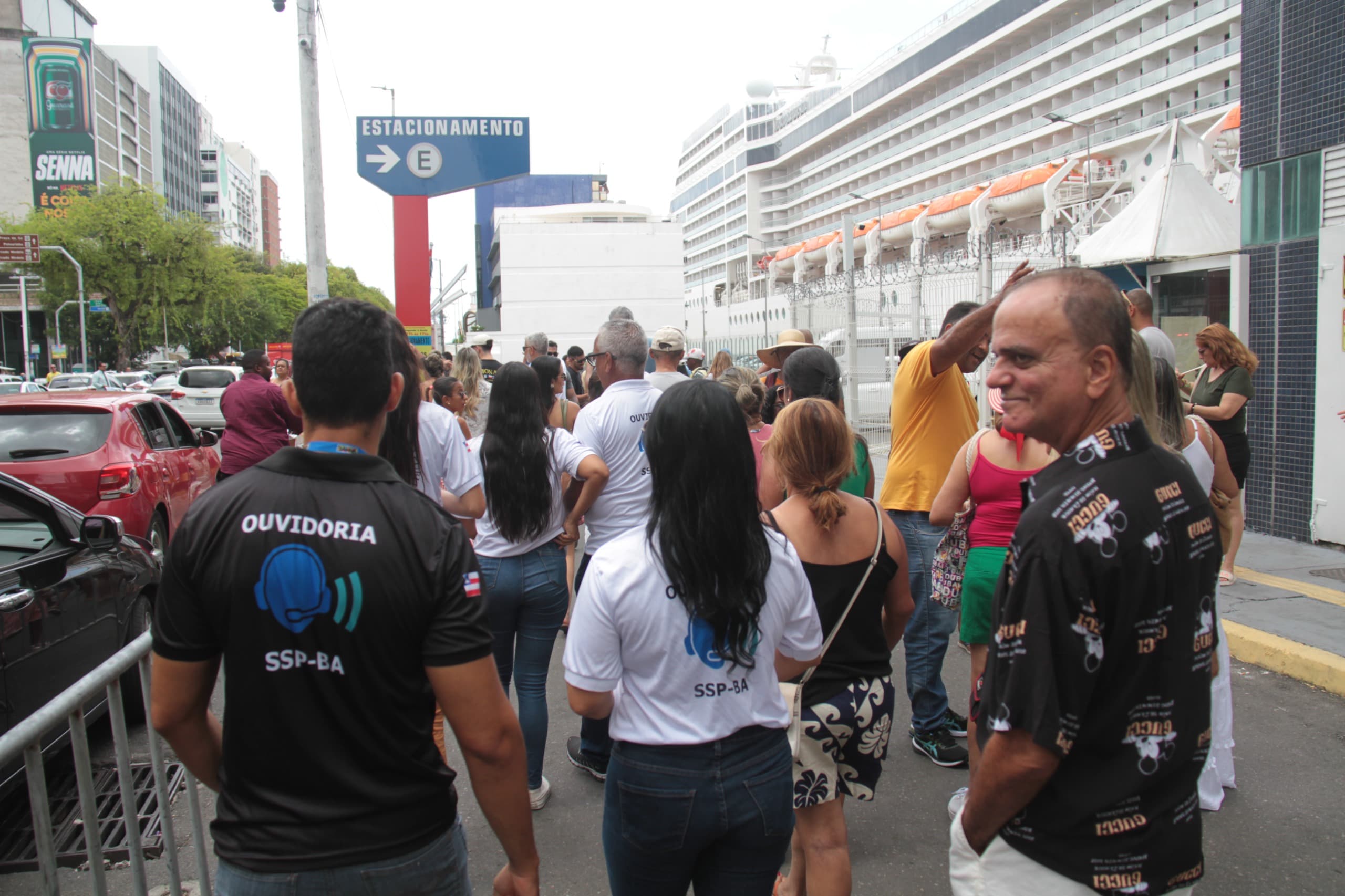 A Ouvidoria Geral da Secretaria da Segurança Pública (SSP) recepcionou 10 mil turistas que desembarcaram de dois transatlânticos na manhã desta terça-feira (17), no Terminal Náutico de Salvador. Essa é a primeira vez que a pasta da SSP integra a Operação Navio, que mobiliza mais de 1.000 mil policiais militares, civis e bombeiros em ações contínuas e oferece serviço bilíngue em regiões turísticas da capital baiana.