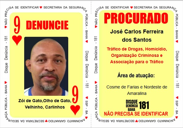 A carta "9 de Copas" apresenta José Carlos Ferreira dos Santos, conhecido “Olho de Gato” e “Zói de Gato”. Ele é apontado como líder de uma facção criminosa que atua nos bairros de Cosme de Farias e Nordeste de Amaralina, em Salvador.