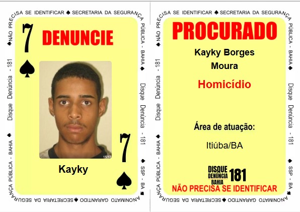 Na carta "7 de Espadas" foi incluído Kayky Borges Moura, procurado por dois mandados de prisão relacionados a homicídios no município de Itiúba, no interior da Bahia.