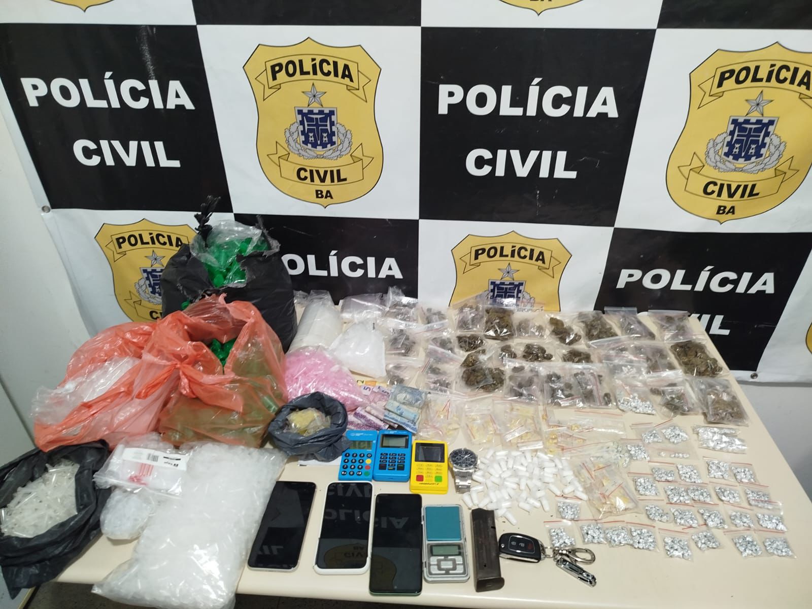 Os policiais civis encontraram a casa do suspeito, que estava com o comparsa. No local, foram encontrados 172g de crack embalados para a venda, 210g de maconha, 54 g de cocaína, três aparelhos celulares, uma balança, R$39 reais, um relógio, um carregador de pistola e um caderno com anotações sobre o tráfico de drogas.