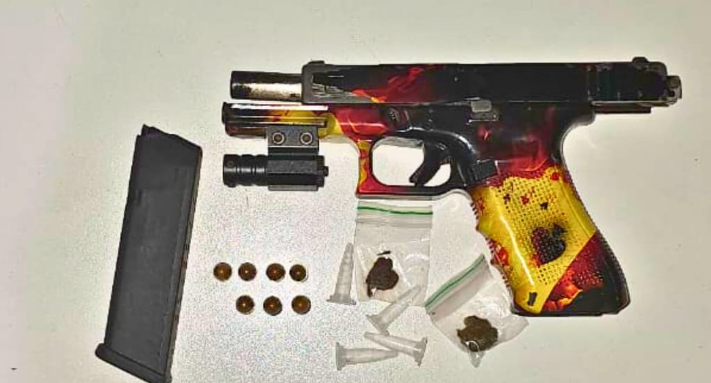 Na ação, foram apreendidos uma pistola com seletor de rajada e mira a laser, um carregador, munições, quatro pinos de cocaína e duas porções de maconha.