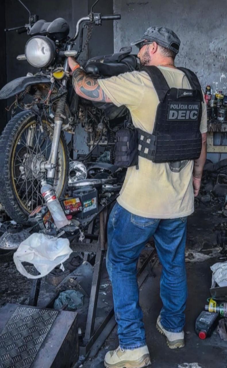 Um homem de 51 anos suspeito de receptação e adulteração de veículos foi preso no local. Cinco motocicletas desmanchadas, diversas peças de motos furtadas, ferramentas e um celular foram apreendidos na oficina.