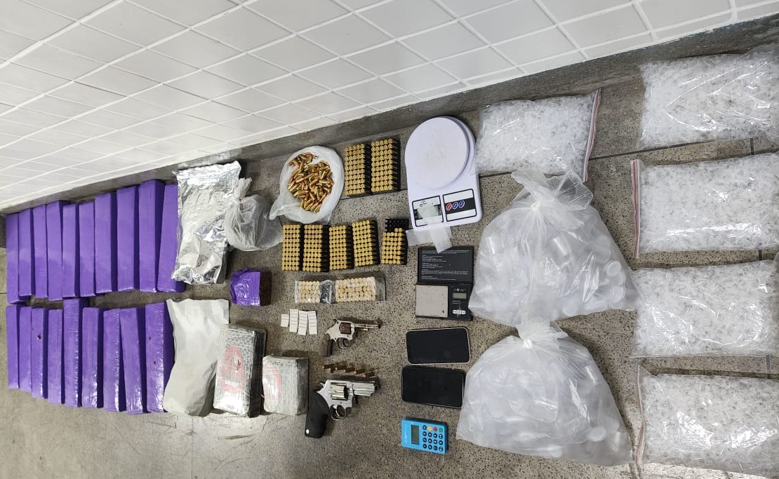Ao realizar a abordagem, a guarnição encontrou um revólver calibre 22, 492 munições de calibres .40, 38, 9mm e 380, duas balanças de precisão, 22kg de maconha, 1,5kg de cocaína, sete pacotes com pinos vazios e dinheiro em espécie.