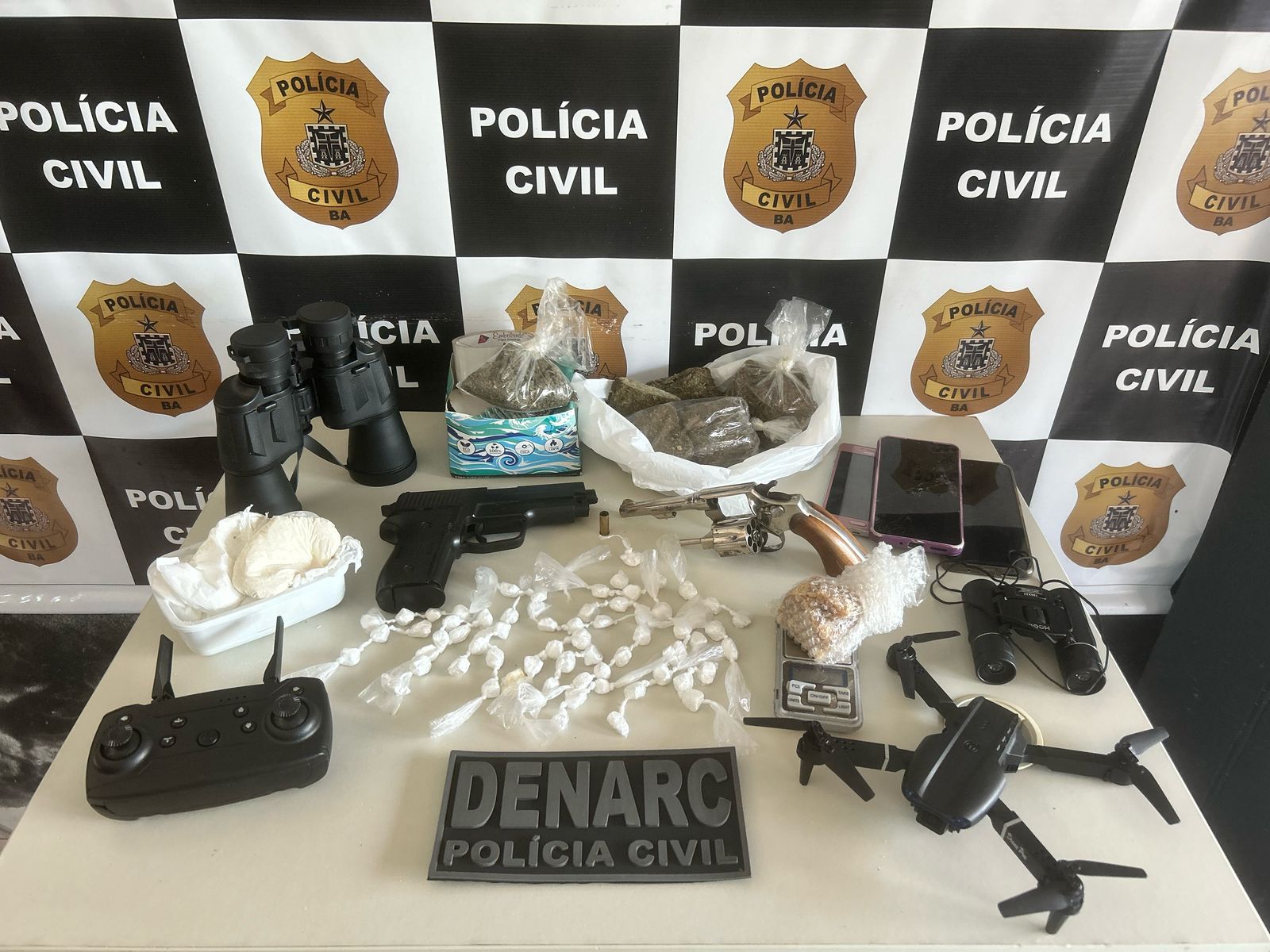 Durante as diligências de combate ao narcotráfico, que contaram com apoio de equipes do Departamento de Repressão e Combate à Corrupção, ao Crime Organizado e à Lavagem de Dinheiro (Draco), quatro mandados de busca e apreensão foram cumpridos em imóveis ligados aos investigados. Arma de fogo, drogas, veículos, drone e binóculos, usados pelos criminosos para monitorar a aproximação da polícia nos pontos de venda de entorpecentes foram apreendidos.