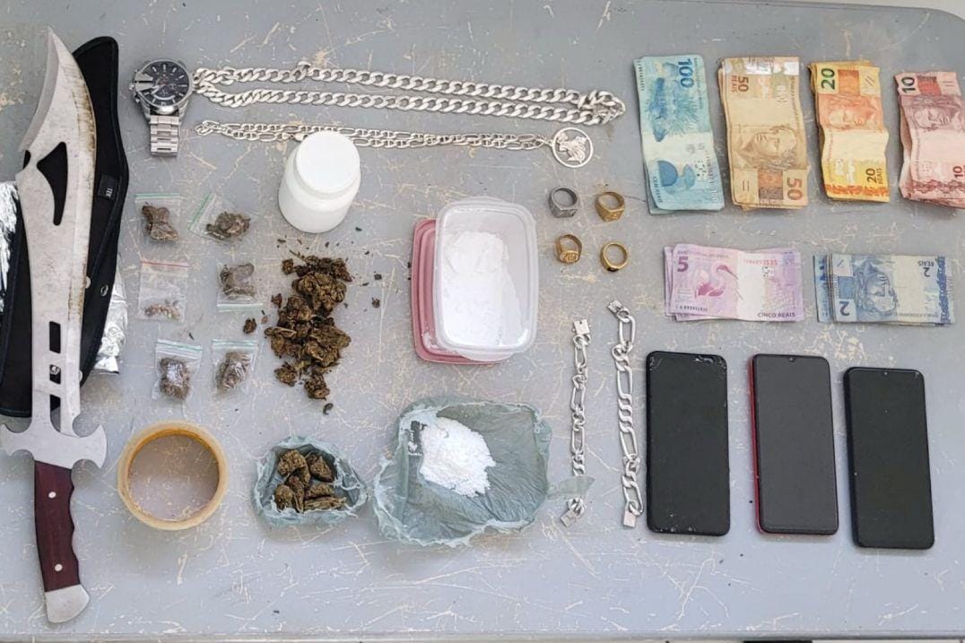 Um deles foi alcançado. Com ele, foram encontrados sete porções de maconha, um papelote de cocaína, ácido bórico, papel laminado, três aparelhos de celulares, uma faca, fita adesiva e dinheiro em espécie.