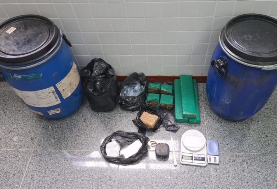 Os agentes faziam rondas na localidade quando avistaram o homem em atitude suspeita. Ao perceber a presença da polícia, ele tentou fugir, mas logo foi alcançado. Na abordagem, os militares identificaram que ele era procurado pelos crimes de homicídio e tráfico de drogas. Além disso, o suspeito portava três tabletes de maconha e quatro porções da mesma droga, duas pedras de crack, duas barras de cocaína e balanças de precisão.