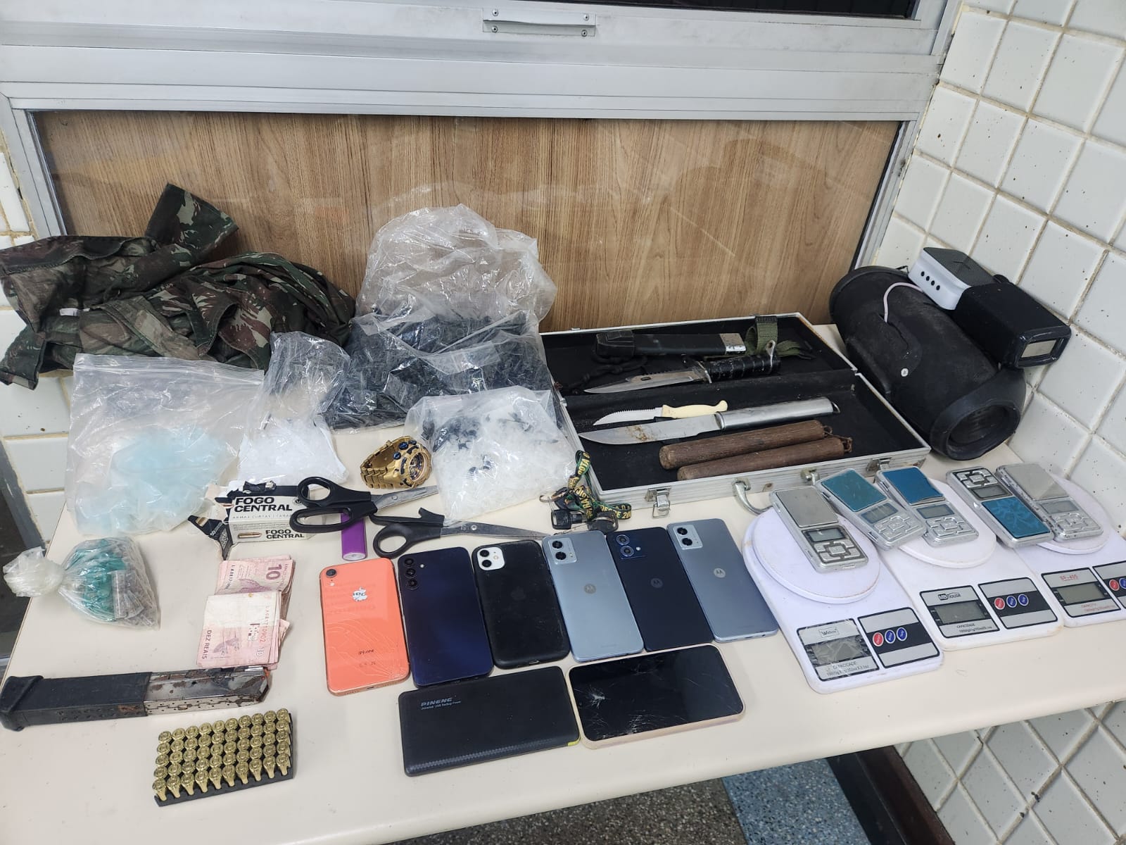 Com ele, foram encontrados um carregador de pistola alongado, 50 munições calibre 9mm, 49 frascos contendo K9, 20 pedras de crack, quatro pacotes de maconha, oito balanças de precisão, três facas, sete celulares, três chaves de moto e materiais comumente utilizados no fracionamento e comercialização de drogas.