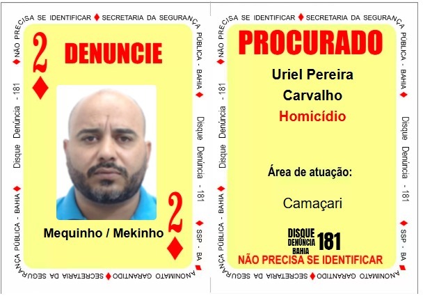 Procurado pelos crimes de roubo e extorsão, Edson dos Santos da Silva, conhecido como “Chiquinho”, foi incluído na carta ‘Quatro de Copas’. Ele atua nos municípios de Queimadas e Nordestina. Já Uriel Pereira Carvalho, conhecido como “Mequinho” ou “Mekinho”, ocupa a posição do ‘Dois de Ouros’. Procurado por homicídio, ele é apontado como o chefe do tráfico de drogas em Camaçari, na Região Metropolitana de Salvador. Em 2024, ele ordenou o espancamento até a morte de um homem, cuja vítima teve o corpo abandonado pelos agressores.