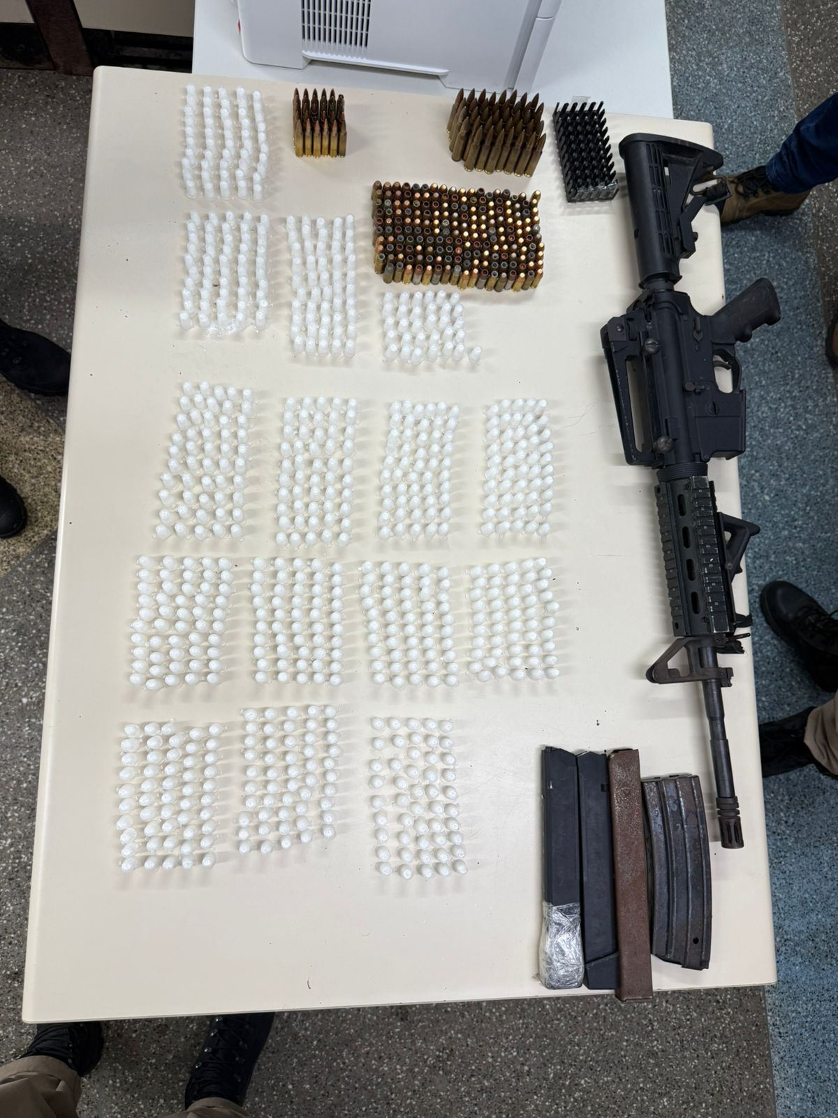 Guarnições foram deslocadas para averiguar a situação. Ao chegarem ao endereço informado, os suspeitos perceberam a aproximação policial e fugiram. Durante a varredura, foram apreendidos um fuzil, 248 munições de diversos calibres, 731 pinos de cocaína, além de carregadores, capas de coletes, uma mochila, uma pochete e uma camisa camuflada.
