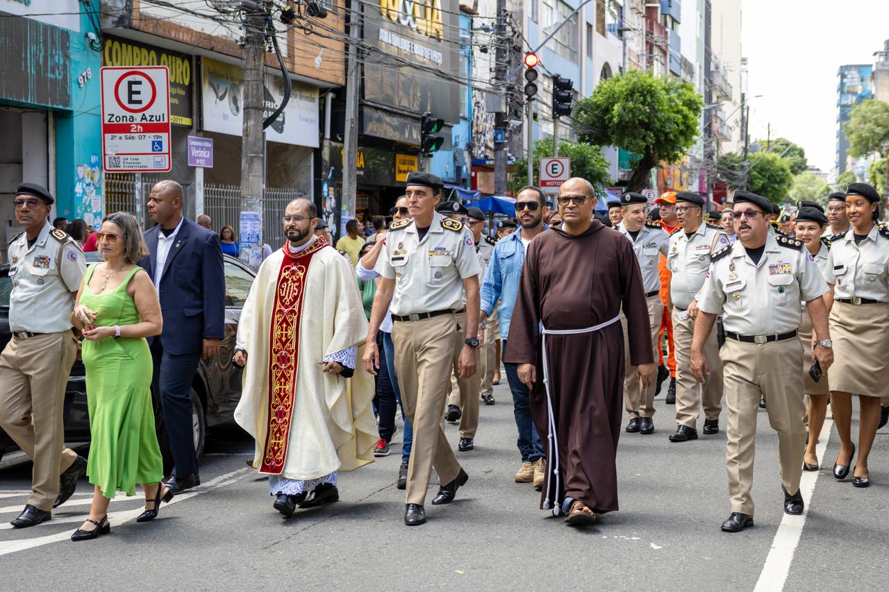 A programação teve início às 9h, com uma carreata partindo da Capelania da Vila Policial Militar do Bonfim em direção à Igreja da Piedade dos Capuchinhos, no centro de Salvador. Às 10h, foi celebrada a Missa Solene, presidida pelo capelão católico da PMBA, Padre Dimas, com a presença do comandante-geral, coronel Magalhães, do subcomandante-geral, coronel Lopes, além de oficiais, praças e membros da comunidade cristã.