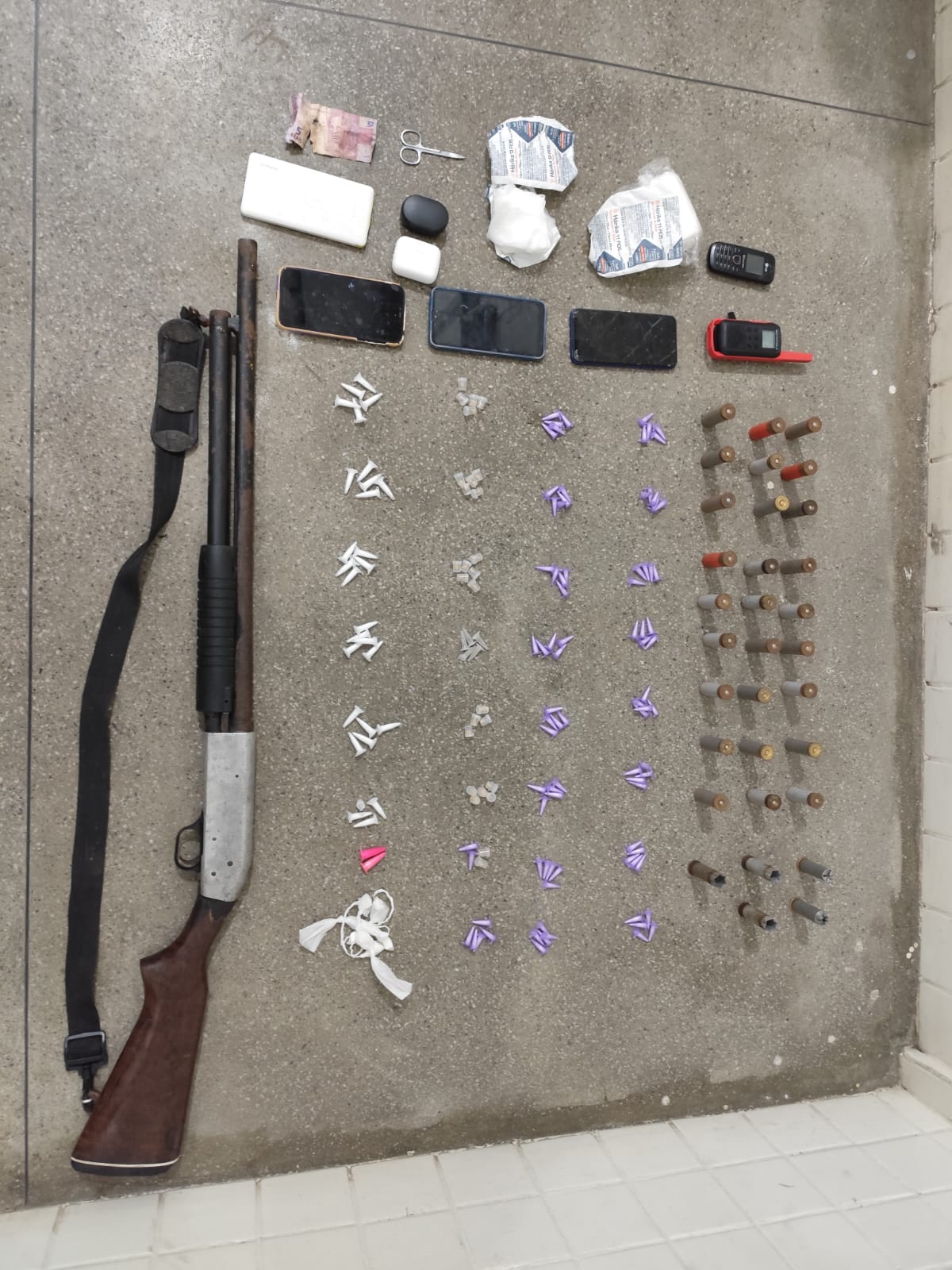 A guarnição realizou uma varredura no local e apreendeu, além da arma longa com o suspeito, os dois veículos sendo um modelo Ford Ka de cor prata e um Volkswagen Gol de cor cinza: 29 munições de calibre 12; 117 pinos de cocaína; seis saquinhos de cocaína; 27 pedras de crack; cinco embalagens com K9; quatro aparelhos celulares; um carregador portátil; um rádio comunicador; um kit com primeiros socorros e R$ 5 em espécie. Todo material e veículos apreendidos foram apresentados na 23ª Delegacia Territorial onde a ocorrência foi registrada.