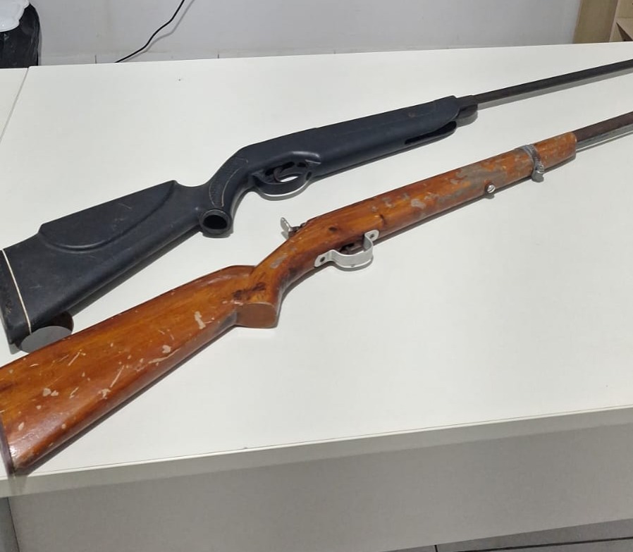 Em outro local do município, duas armas artesanais também foram apreendidas após serem abandonadas por um suspeito que fugiu ao perceber a aproximação dos policiais. Os armamentos estavam em uma área utilizada como ponto de apoio ao tráfico de drogas.