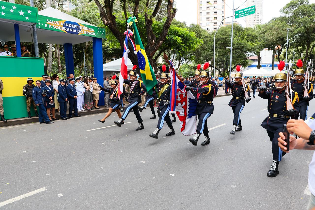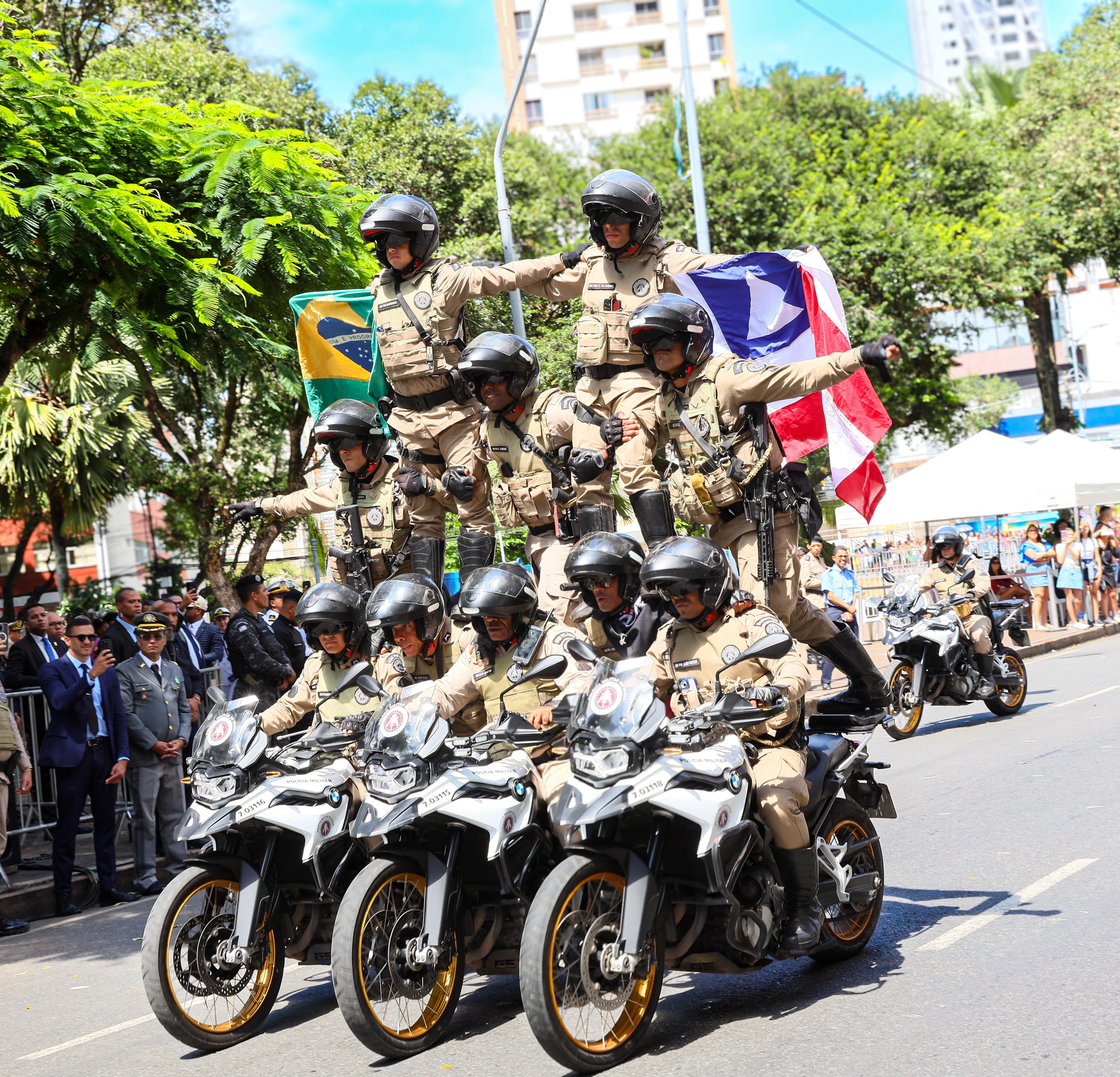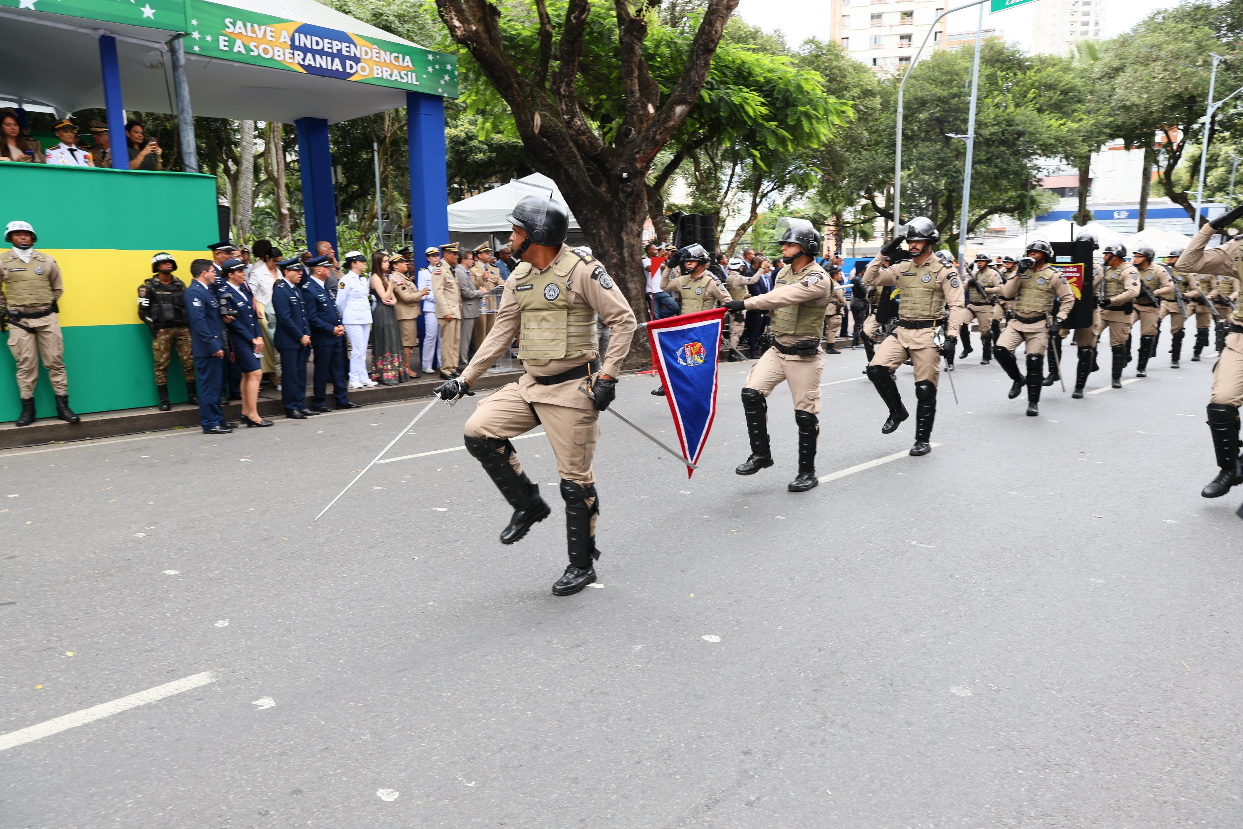 Com orgulho de vestir a farda que carrega uma história de 200 anos, 896 integrantes da Polícia Militar da Bahia desfilaram na capital baiana para comemorar a independência do Brasil, neste domingo, 7 de setembro. Além da tropa, policiais militares da reserva, os veteranos, alunos dos colégios da Polícia Militar (CPM), a frota de veículos, bem como os animais que auxiliam o trabalho da Polícia Militar também marcaram presença no desfile.