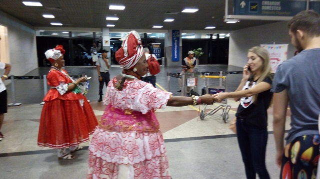 Duas Baianas tipicamente trajadas distribuindo folhetos e fitinhas do Senhor do Bonfim, um trio de forró e casais dançando músicas do período junino fizeram a alegria dos turistas que deixavam Salvador. A operação acontece até o próximo domingo, dia 18, e foi elogiada pela agente de viagens de Porto Alegre Ana Paula Santana, que estava acompanhada do marido, Luís Henrique Rodrigues. Ela disse que veio descansar em Sauipe, mas resolveu matar a curiosidade e ir para a folia.