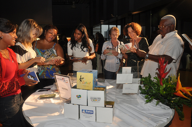 Funcionários e convidados da Bahiatursa observam detalhes da exposição comemorativa dos 45 anos