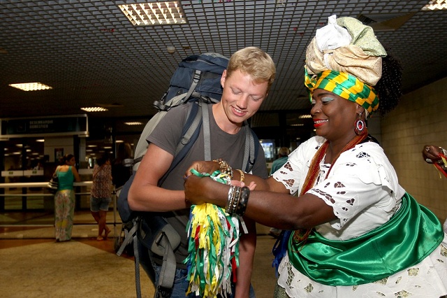 Logo após desembarcar no aeroporto, o turista alemão Steffen Schmidt, 21 anos, recebeu a bênção e a fitinha do Senhor do Bonfim de baianas vestidas tipicamente. Ele veio à Bahia para assistir à disputa entre Alemanha e México nesta quinta-feira (4). Nos três dias na capital, ele diz que deseja conhecer museus, arquitetura e a cultura - especialmente o forró -, coisas das quais já ouviu falar bem.