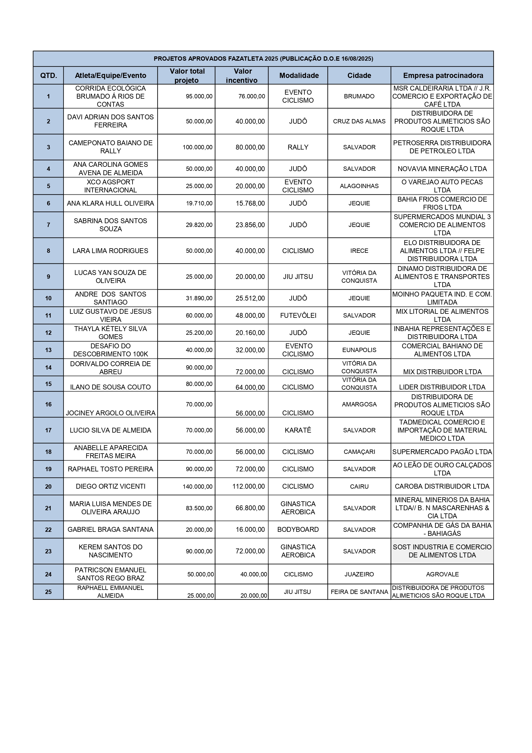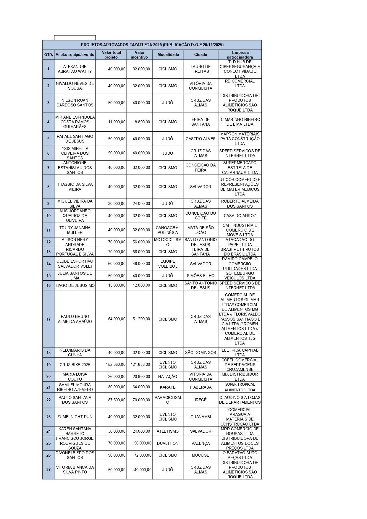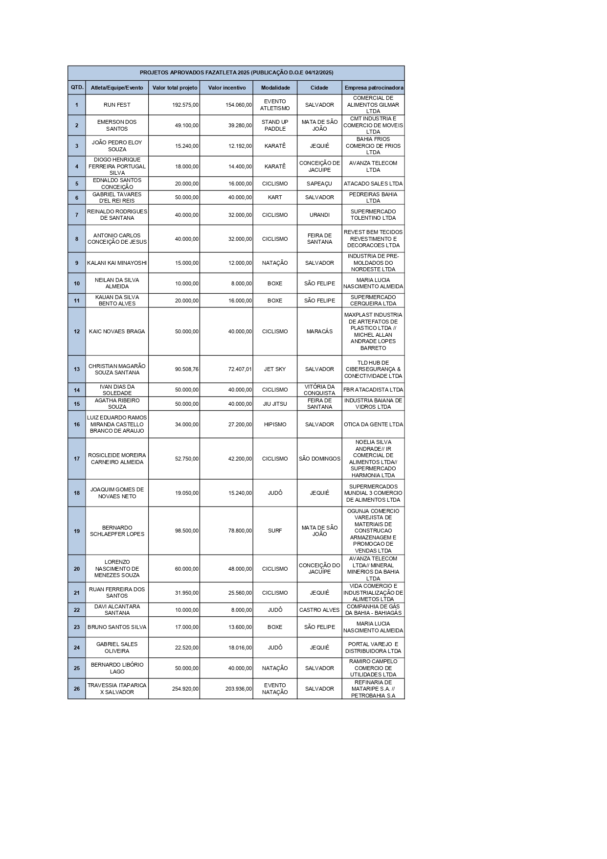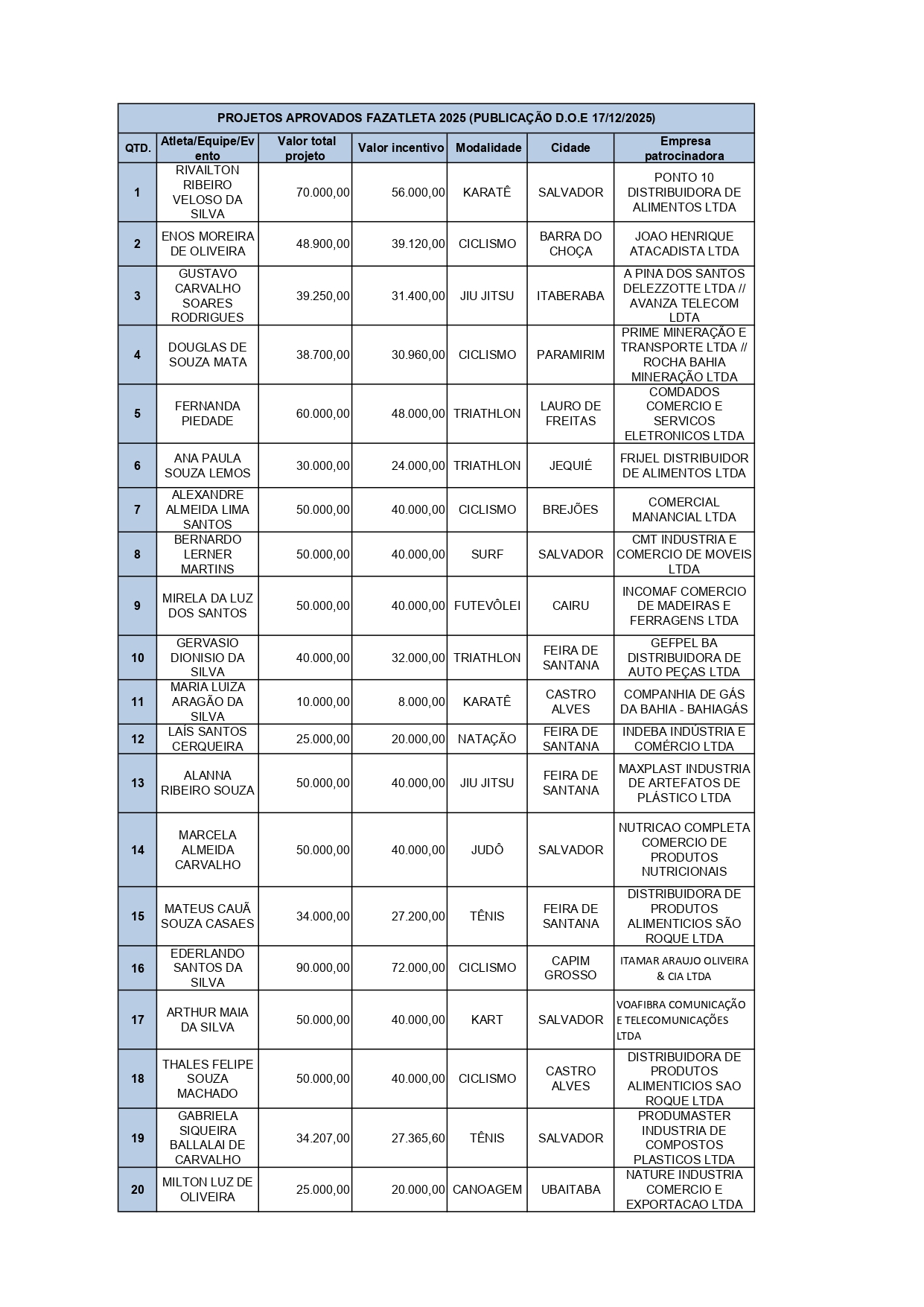 Atletas contemplados e Empresas patrocinadoras