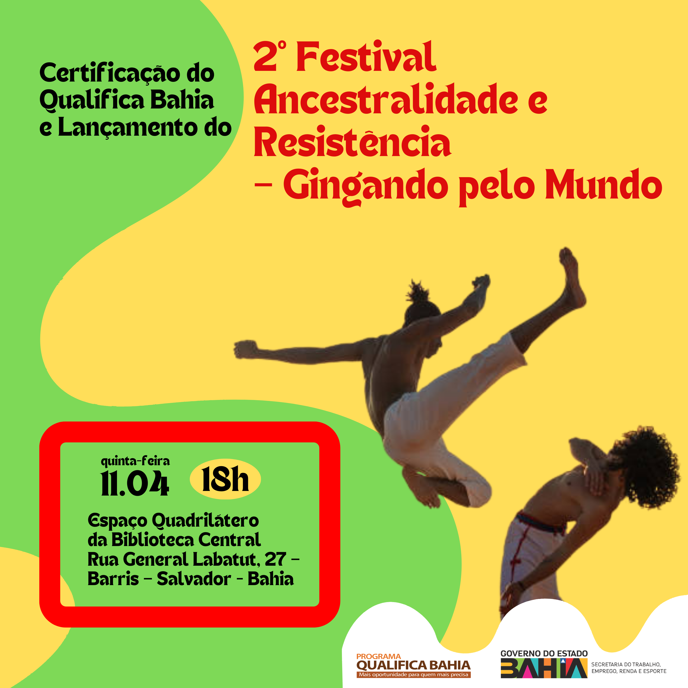 O governo da Bahia, através da Secretaria do Trabalho, Emprego, Renda e Esporte (Setre), lança nesta quinta-feira, 11, o 2º Festival Ancestralidade e Resistência – Gingando pelo Mundo, evento dedicado à capoeira. O ato contará, ainda, com a certificação de 35 capoeiristas do projeto Qualifica Bahia, que participaram da formação profissional em práticas pedagógicas relacionadas à capoeira como expressão cultural afro-brasileira no ambiente escolar.